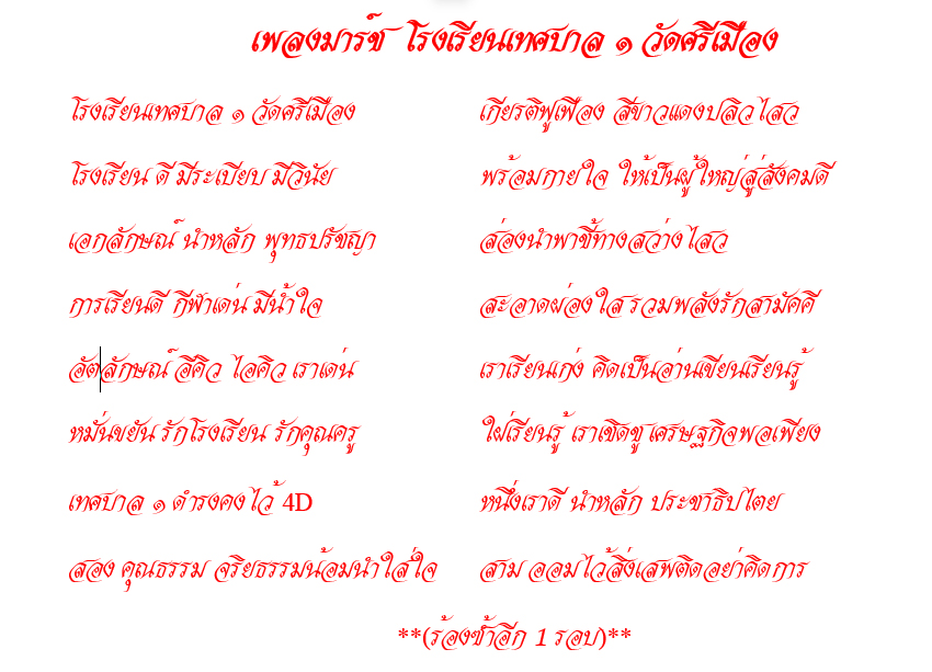 เพลงมาร์ช เพลงมาร์ช โรงเรียนเทศบาล ๑ วัดศรีเมืองคำร้อง / ทำนอง : คุณครูเสมียน ใจผ่อง (อดีตครูโรงเรียนเทศบาล ๑ วัดศรีเมือง