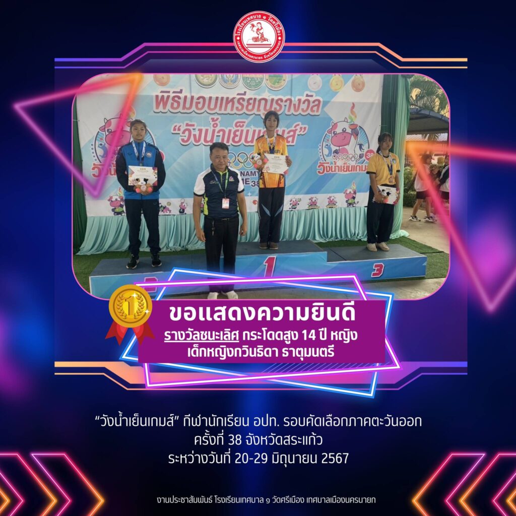 28 มิถุนายน 2567 ผู้อำนวยการโรงเรียนเทศบาล ๑ วัดศรีเมือง นายอำนาจ นาคแก้ว รองผู้อำนวยการนางสาวอังศวีร์ สกุลพลไพศาล คณะผู้บริหาร คณะครูโรงเรียนเทศบาล ๑ วัดศรีเมือง มอบรางวัลให้แก่นักเรียน การแข่งขันกรีฑานักเรียน อปท. รอบคัดเลือกภาคตะวันออก ครั้งที่ 38 “วังน้ำเย็นเกมส์” จ.สระแก้ว