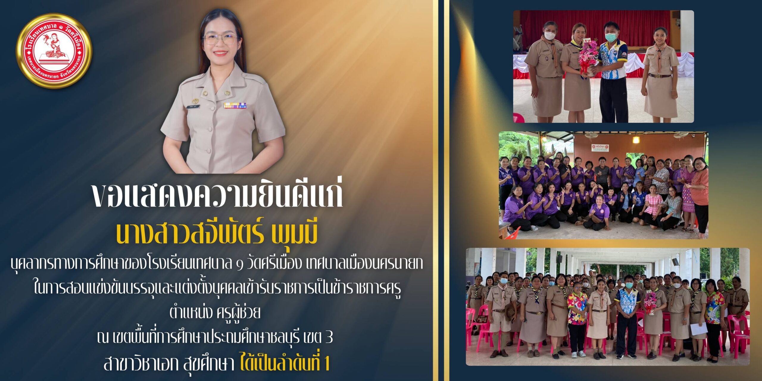 28 มิถุนายน 2567 คณะผู้บริหาร คณะครู บุคลากรทางการศึกษา และนักเรียนโรงเรียนเทศบาล ๑ วัดศรีเมือง ขอแสดงความยินดีแก่ นางสาวสจีพัตร์ พุมมี บุคลากรทางการศึกษาของโรงเรียนเทศบาล ๑ วัดศรีเมือง เทศบาลเมืองนครนายก ในการสอบแข่งขันบรรจุและแต่งตั้งบุคคลเข้ารับราชการเป็นข้าราชการครูตำแหน่ง ครูผู้ช่วย