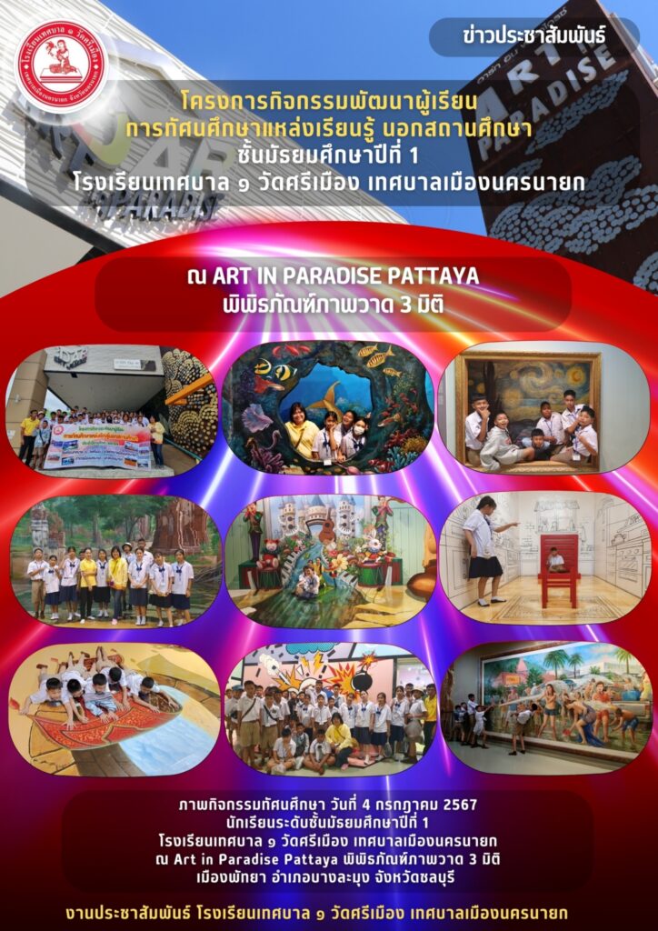 วันที่ 5 กรกฎาคม 2567 ชั้นมัธยมศึกษาปีที่ 1 ทัศนศึกษา ณ ART IN PARADISE PATTAYA “พิพิธภัณฑ์ภาพวาด 3 มิติ” เมืองพัทยา อำเภอบางละมุง จังหวัดชลบุรี โครงการกิจกรรมพัฒนาผู้เรียน การทัศนศึกษาแหล่งเรียนรู้ นอกสถานศึกษ โรงเรียนเทศบาล ๑ วัดศรีเมือง เทศบาลเมืองนครนายก