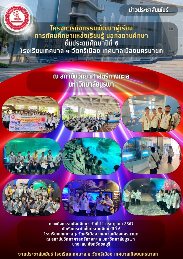 11 กรกฎาคม 2567 กิจกรรมทัศนศึกษา ชั้นประถมศึกษาปีที่ 6 โรงเรียนเทศบาล ๑ วัดศรีเมือง เทศบาลเมืองนครนายกณ สถาบันวิทยาศาสตร์ทางทะเล มหาวิทยาลัยบูรพา บางแสน จังหวัดชลบุรี โครงการกิจกรรมพัฒนาผู้เรียนการทัศนศึกษาแหล่งเรียนรู้ นอกสถานศึกษา