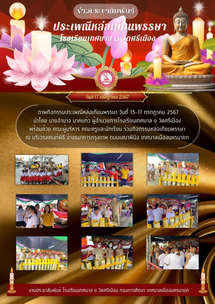 15-17 กรกฎาคม 2567 นำโดย นายอำนาจ นาคแก้ว ผู้อำนวยการโรงเรียนเทศบาล ๑ วัดศรีเมือง พร้อมด้วย คณะผู้บริหาร คณะครูและนักเรียน ร่วมกิจกรรมหล่อเทียนพรรษา ณ บริเวณเตนท์พิธี ข้างธนาคารกรุงเทพ ถนนเสนาพินิจ เทศบาลเมืองนครนายก