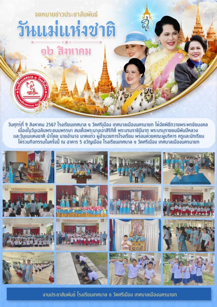 9 สิงหาคม 2567 โรงเรียนเทศบาล ๑ วัดศรีเมือง เทศบาลเมืองนครนายก ได้จัดพิธีถวายพระพรชัยมงคลเนื่องในวันเฉลิมพระชนมพรรษา สมเด็จพระนางเจ้าสิริกิติ์ พระบรมราชินีนาถ พระบรมราชชนนีพันปีหลวง และวันแม่แห่งชาติ นำโดย นายอำนาจ นาคแก้ว ผู้อำนวยการโรงเรียน พร้อมด้วยคณะผู้บริหาร ครูและนักเรียนได้ร่วมกิจกรรมในครั้งนี้ ณ อาคาร 5 ขวัญเมือง โรงเรียนเทศบาล ๑ วัดศรีเมือง เทศบาลเมืองนครนายก และได้ทำกิจกรรมบำเพ็ญประโยชน์ภายในโรงเรียน