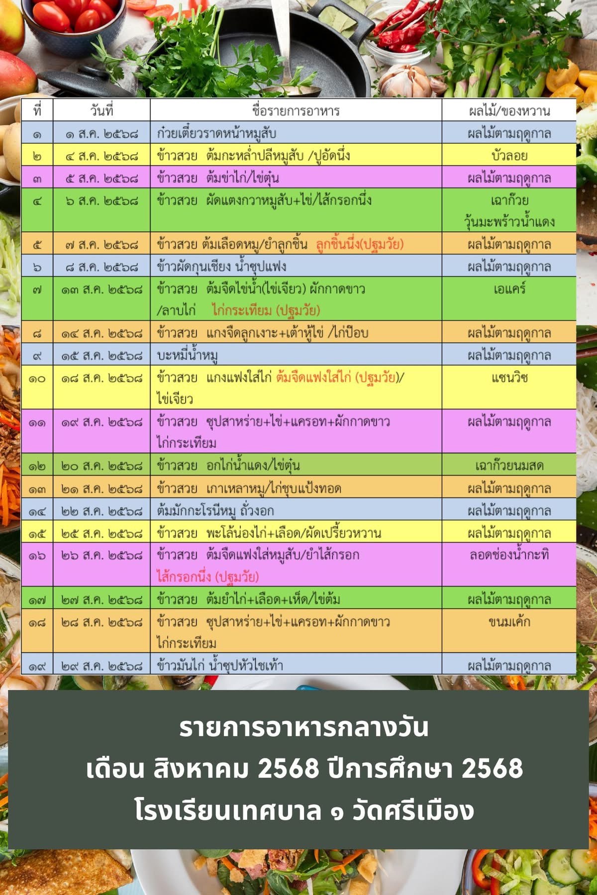 รายการอาหารประจำเดือนสิงหาคม 2568