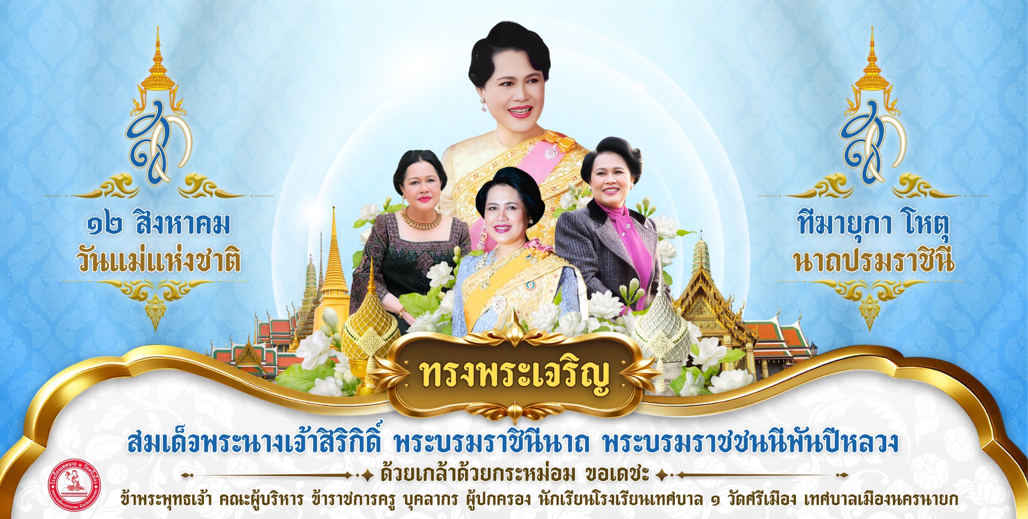 เนื่องในโอกาสวันเฉลิมพระชนมพรรษาสมเด็จพระนางเจ้าสิริกิติ์ พระบรมราชินีนาถ พระบรมราชชนนีพันปีหลวง ๑๒ สิงหาคม พุทธศักราช ๒๕๖๘ ข้าพระพุทธเจ้า คณะผู้บริหาร ข้าราชการครู บุคลากร ผู้ปกครอง และนักเรียน โรงเรียนเทศบาล ๑ วัดศรีเมือง เทศบาลเมืองนครนายก ขอถวายพระพรชัยมงคล ขอพระองค์ทรงพระเจริญยิ่งยืนนาน ทรงพระเกษมสำราญ มีพระพลานามัยสมบูรณ์พูนผล ปราศจากโรคาพยาธิและภัยพาลทั้งปวงทรงพระสถิตสถาพรเป็นมิ่งขวัญร่มโพธิ์ทองของปวงพสกนิกรตราบนานเท่านาน ด้วยเกล้าด้วยกระหม่อม ขอเดชะ