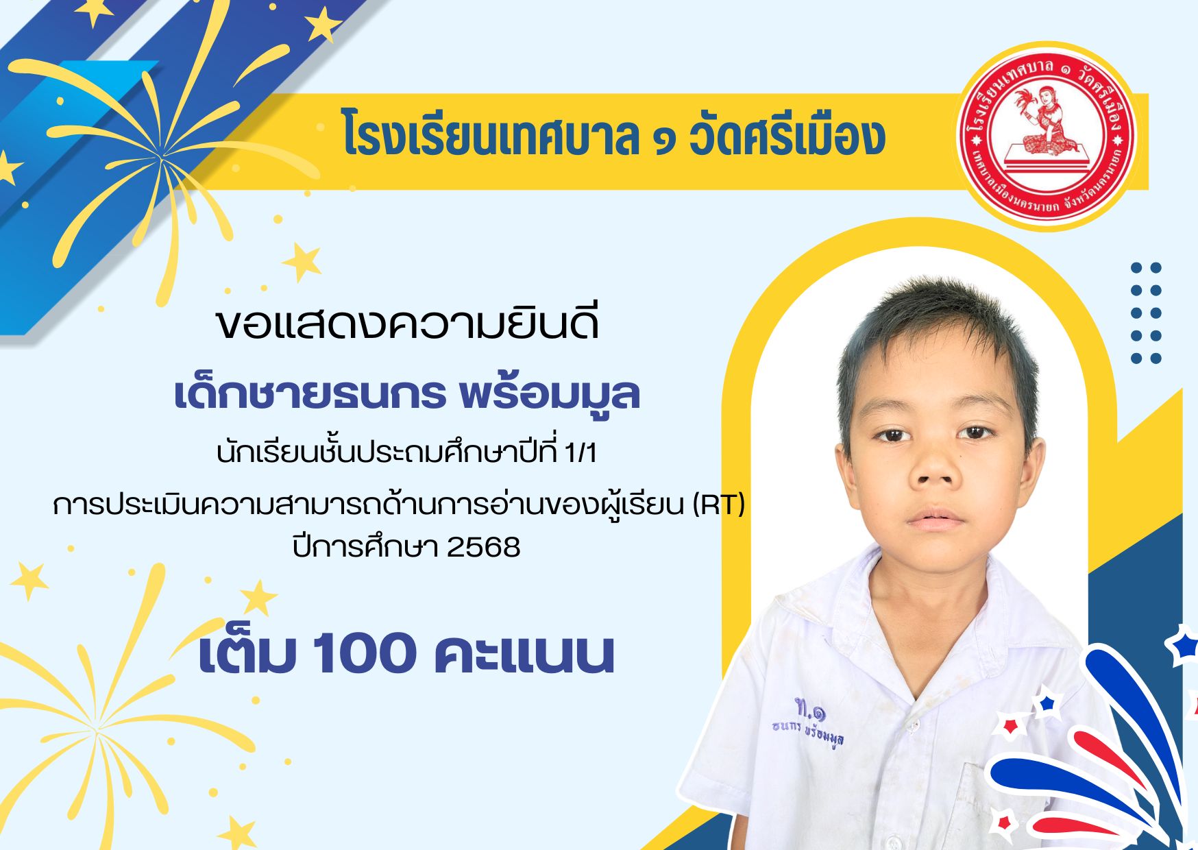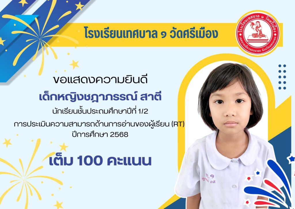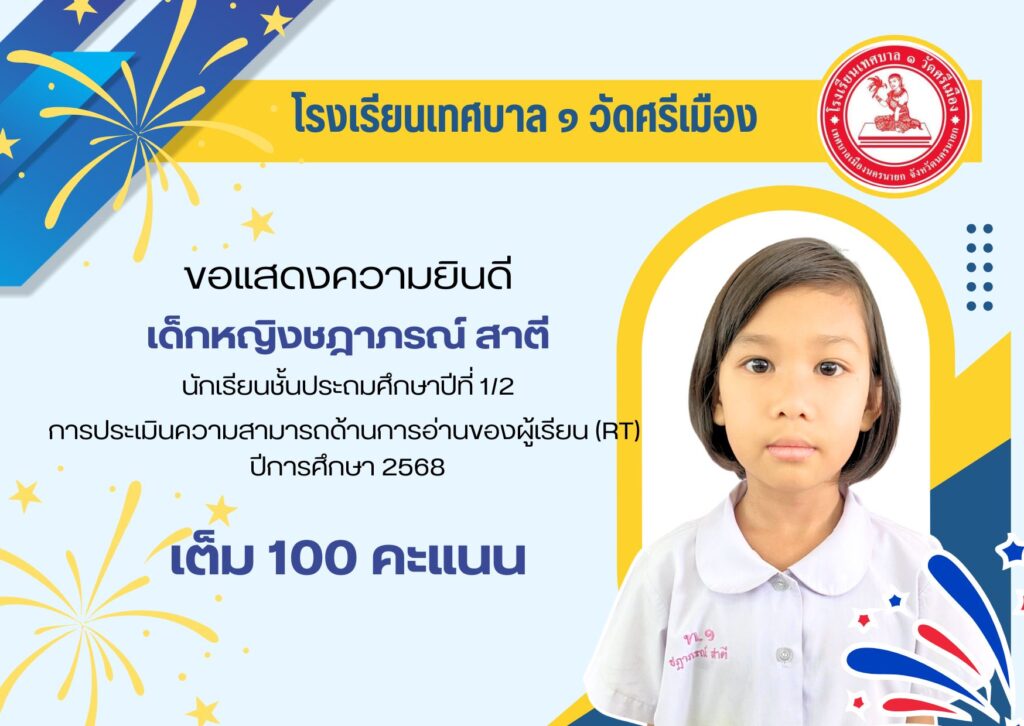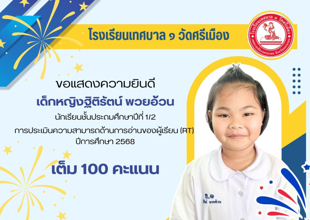 โรงเรียนเทศบาล ๑ วัดศรีเมือง ขอแสดงความยินดีกับนักเรียนที่มีผลการทดสอบเพื่อประเมินความสามารถในการอ่าน (Reading Test : RT) 🎉🎉🎉