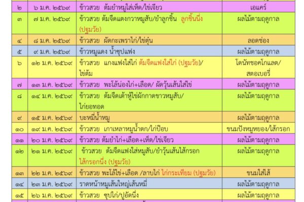 รายการอาหารกลางวัน โรงเรียนเทศบาล ๑ วัดศรีเมือง ตั้งแต่วันที่ ๕ มกราคม ๒๕๖๙ ถึงวันที่ ๓๐ มกราคม ๒๕๖๙